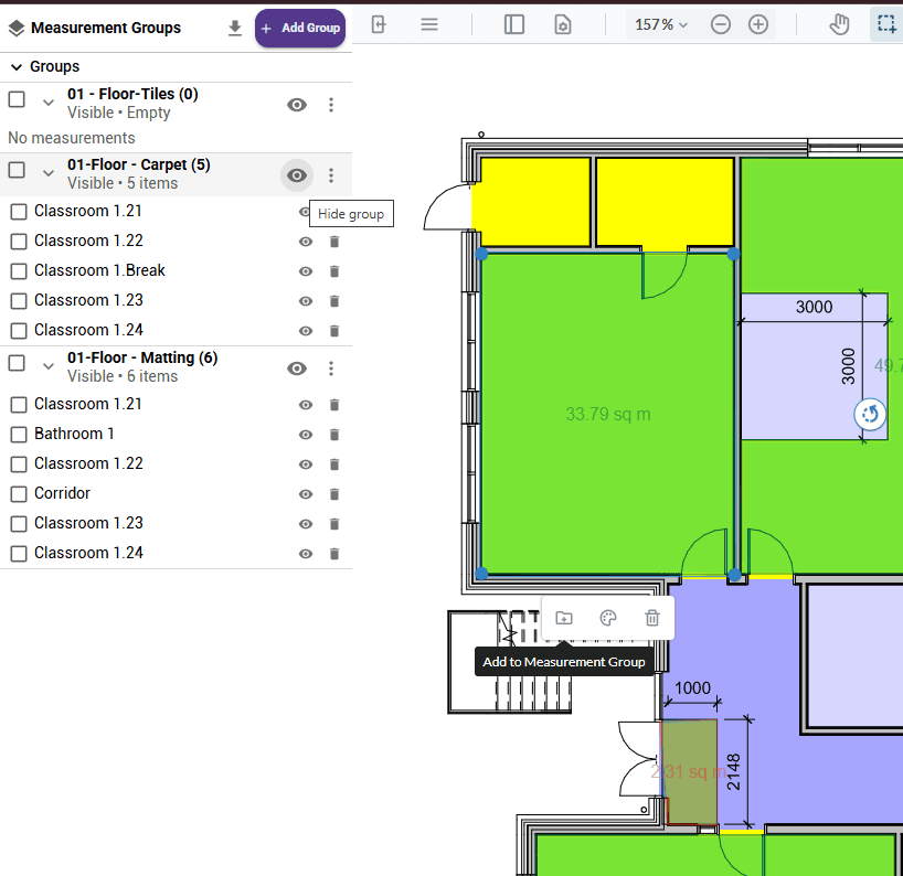 2D Take-Off now includes custom visibility grouping, enabling teams to organise measurements into logical groups and quickly show or hide them as needed. This makes it much easier to work on complex drawings with multiple overlapping measurements, for example by grouping items by system for clearer review and control.